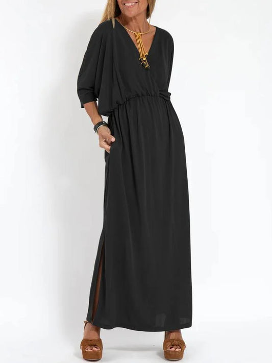 שמלות מפוצלות רפויות עם צווארון V בצבע אחיד לנשים